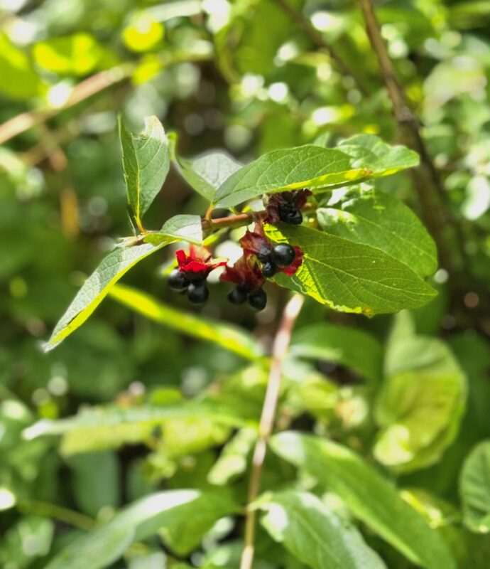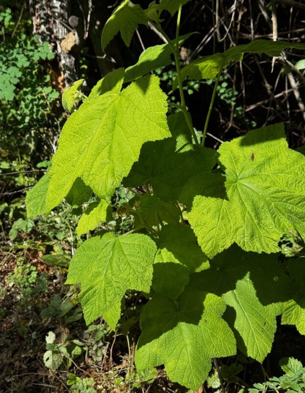 Coast Twinberry – There are 3 varieties of twinberries in CA – we saw Lonicera involucrata var ledebourii called (Twinberry Honeysuckle) on Calscape – its yellow/red flowers and its dark fruit comes in twos – very noteworthy. My other favorite shrub was Thimbleberry (Rubus parviflorus) with its large leaves, and berries that are related to raspberries and blackberries – come back in the summer for those.