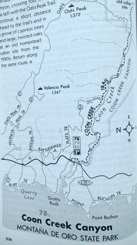 To get to the hike: Take the Lost Osos Valley road to the park entrance, where it becomes Pecho Valley Road – the only way to get there. Continue to the end of the road, 3.9 miles to a large parking lot from the left where other hikes lead from too (such as the beautiful but hotter Point Buchon Trail along the coast – you can see Coon Creek enter the ocean from that trail). For variety you can hike back on the Rattlesnake Flats Trail to see chaparral and coastal scrub but it’s good for even a short walk.
