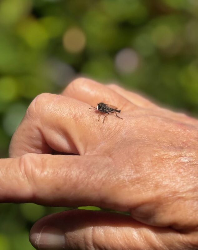 Insects/Butterflies/Birds – we were concentrating mostly on learning the plants but the riparian area’s continual water, thickets of Arroyo willows — a keystone species because it supports so much wildlife– plus other shrubs and trees means multiple insects (see robber fly below) and multiple birds (Black-headed grosbeaks, California thrashers, hummingbirds, wrentits) and many we heard but didn’t see.